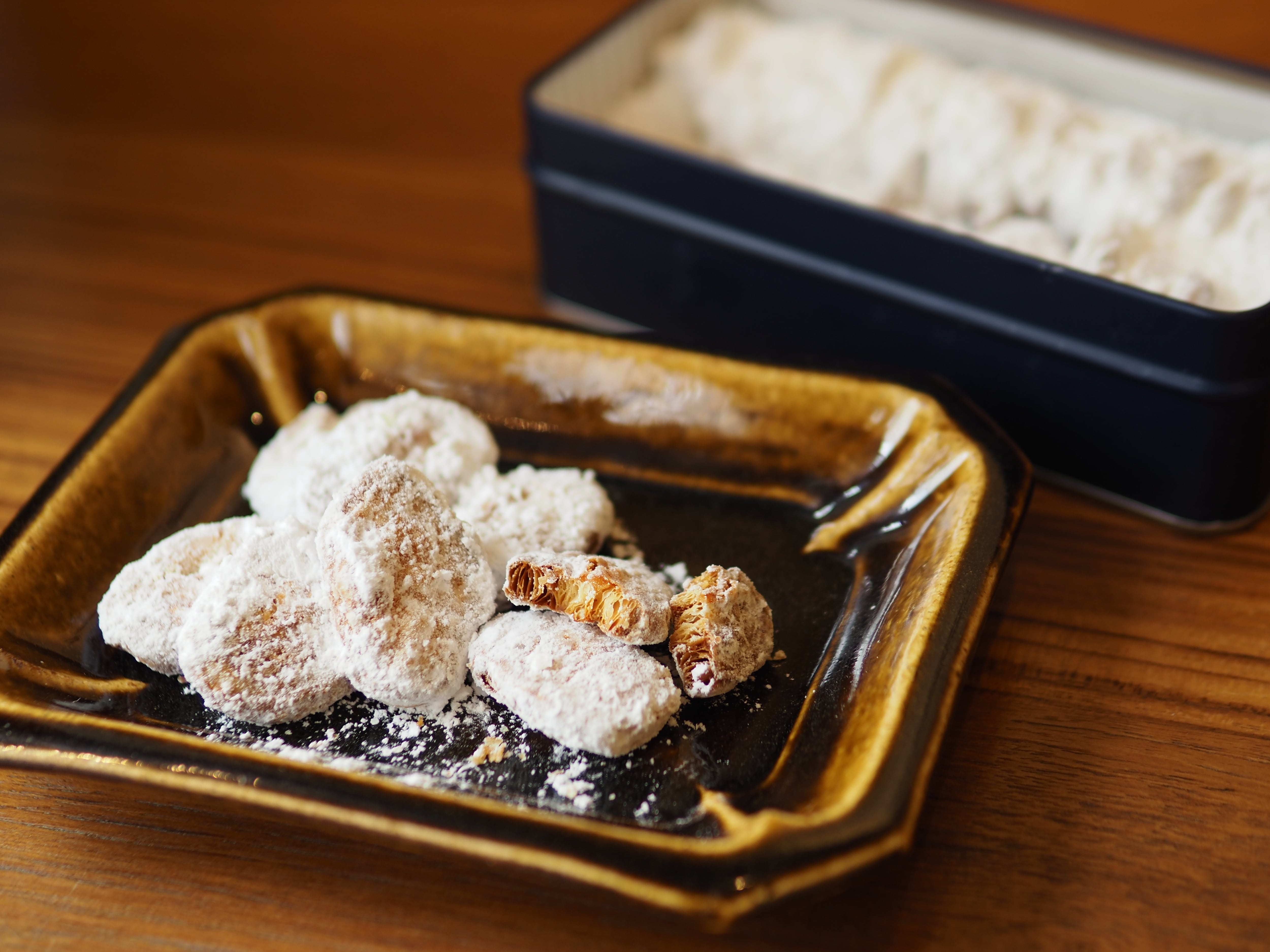 グラナパダーノとエダムチーズを贅沢に生地に折り込み、こんがりと焼き上げた小判型のパイに、粉糖をふんだんにまぶしたチーズパイ。合わせるのは浅煎りほうじ茶に、レモングラスとレモンバーベナをブレンドした【リゾート】。