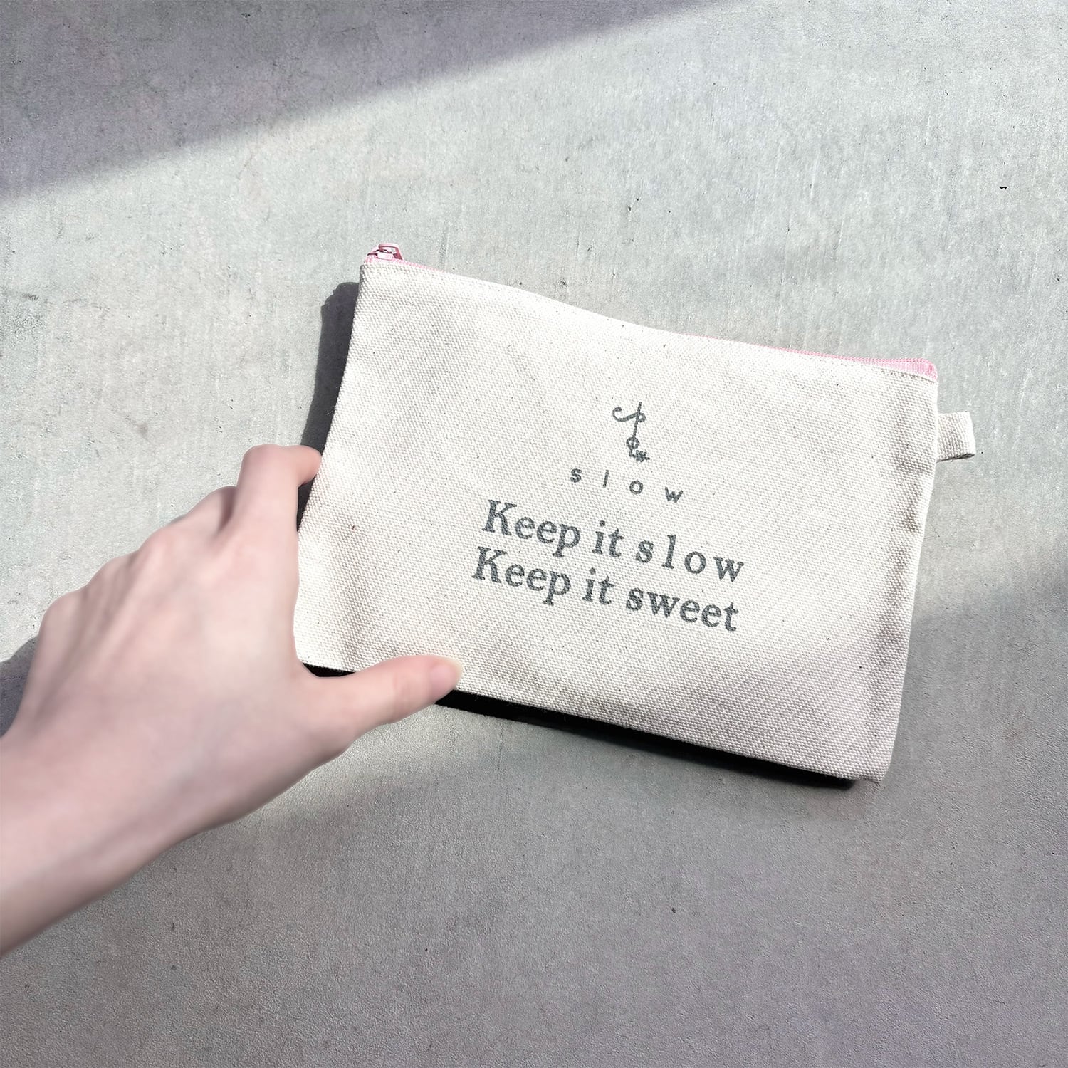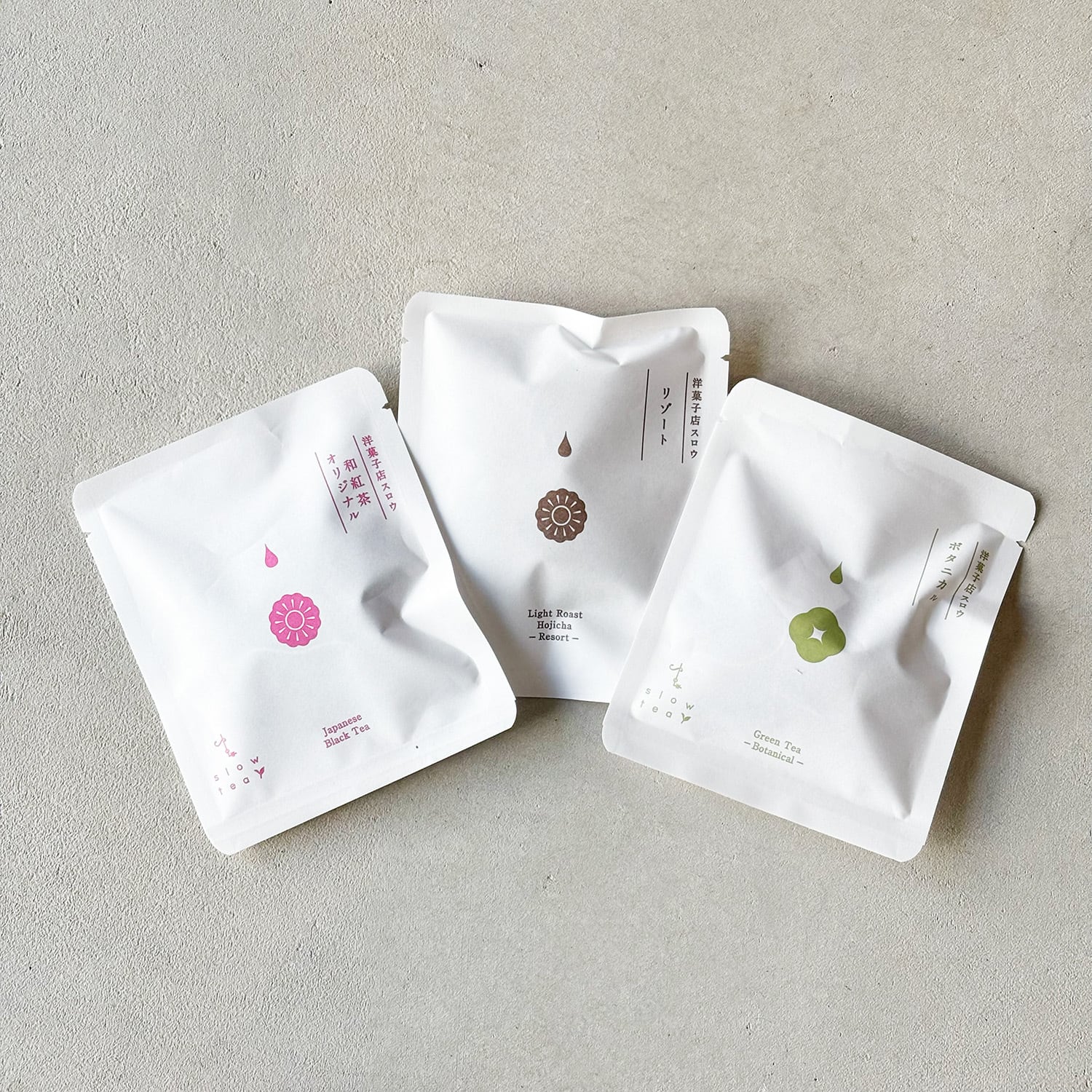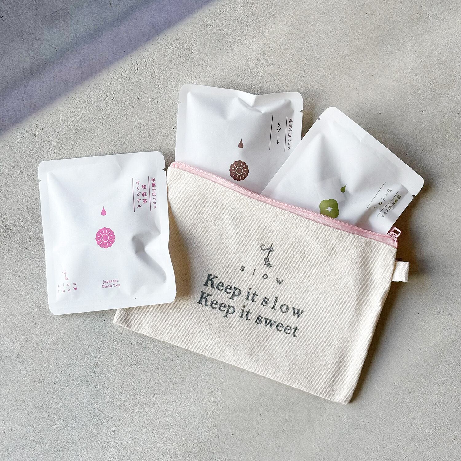 slowのオリジナルポーチにティーバッグ3種を詰め合わせました。